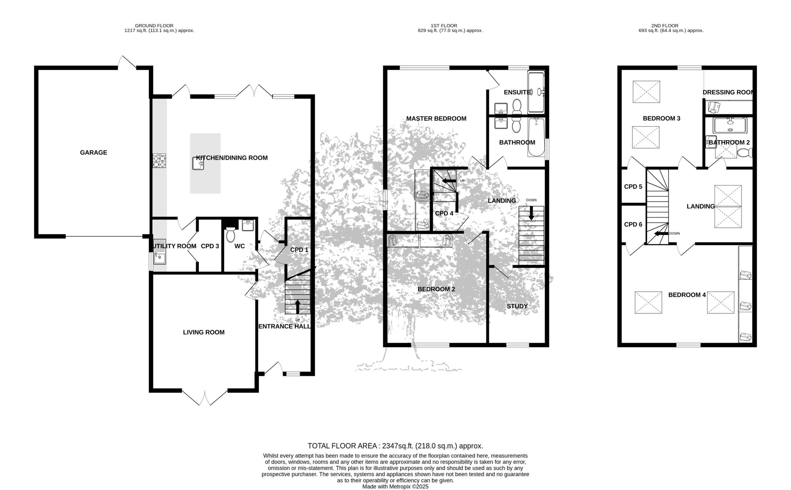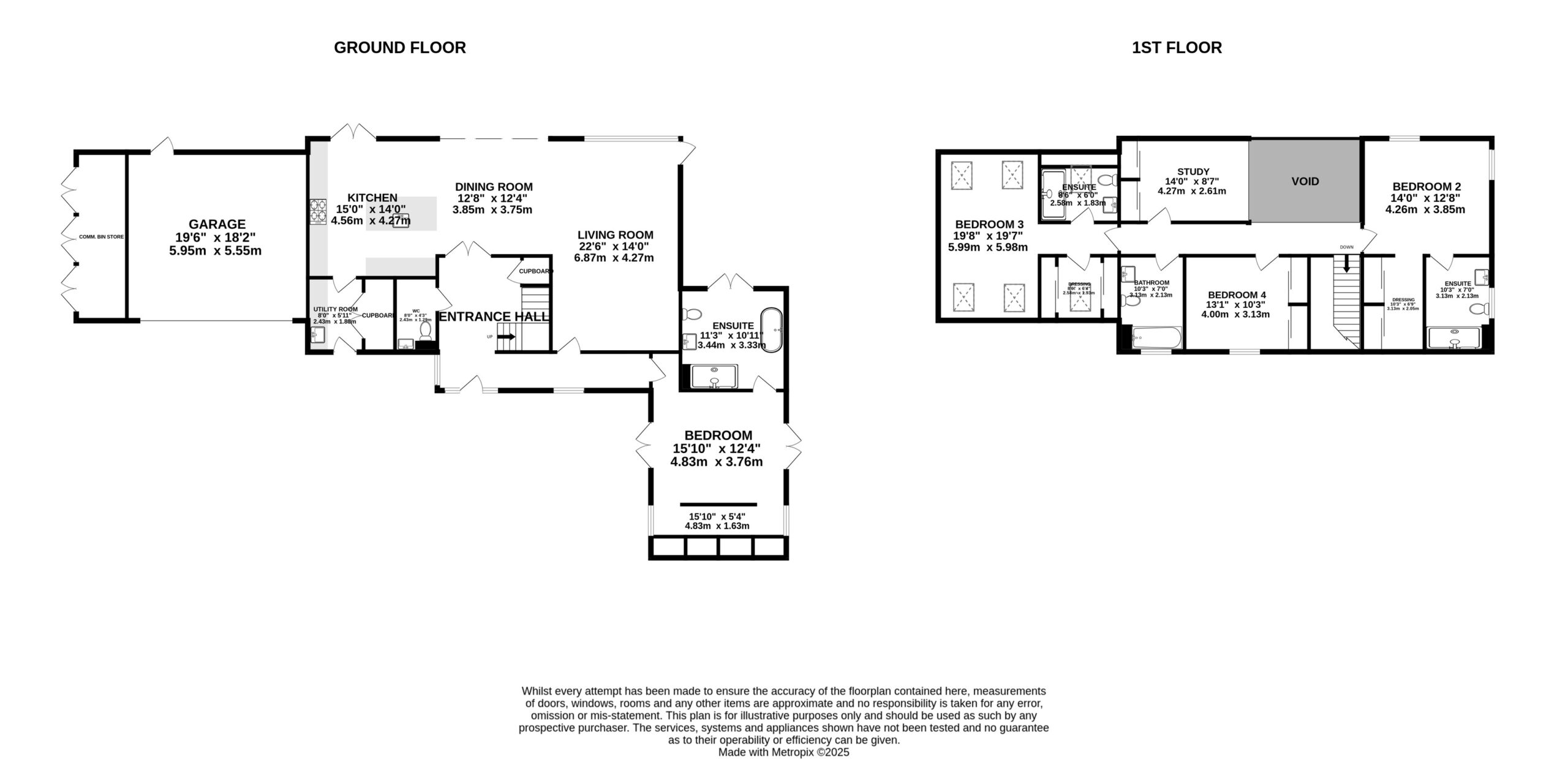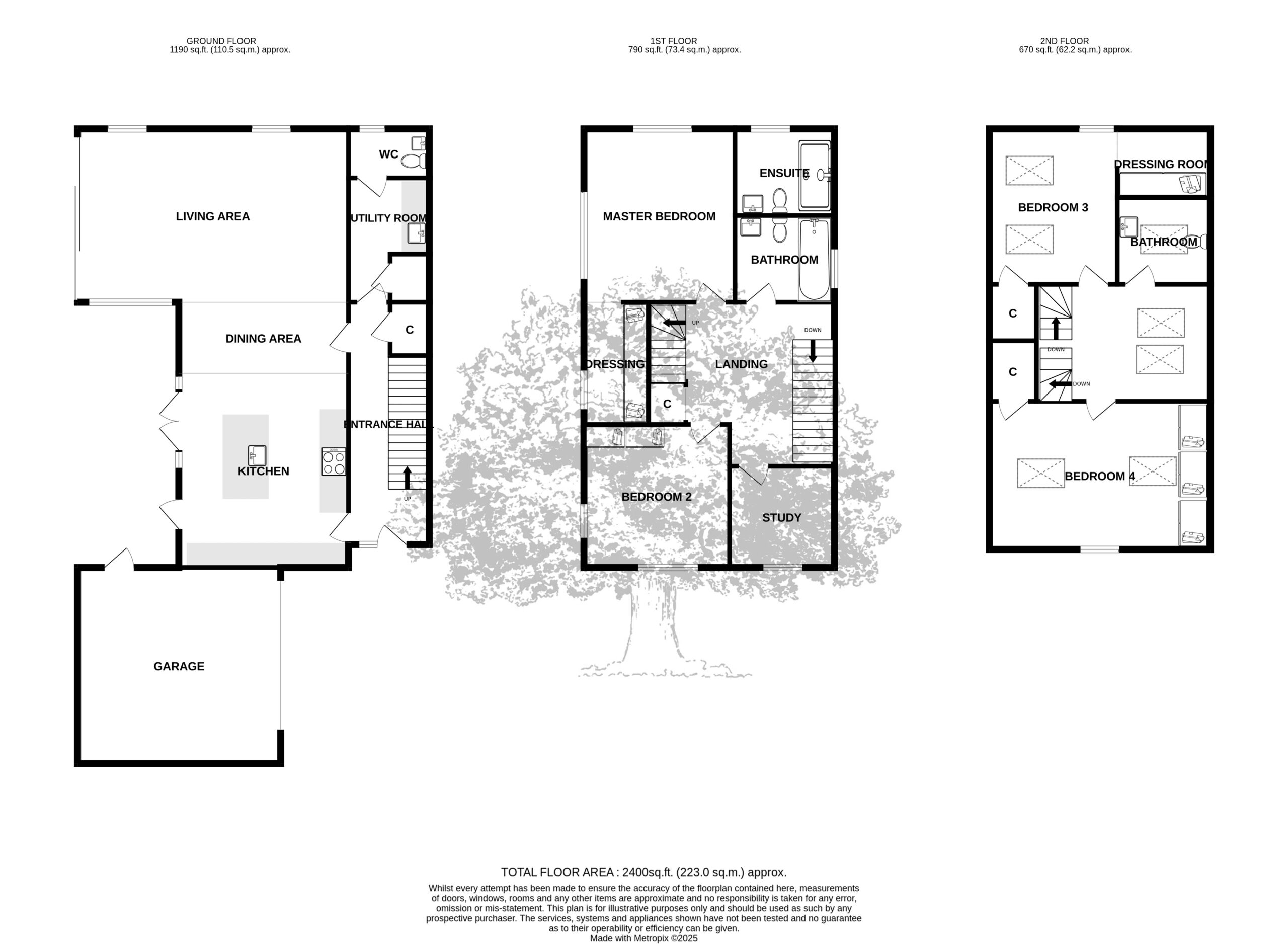 Upstairs, the first floor comprises a second double bedroom ensuite with bespoke oak dressing room, a study, a third ensuite bedroom, and a fourth bedroom with a house bathroom. Externally, the property includes a single garage with E-charging, driveway parking for two vehicles, and visitor parking.