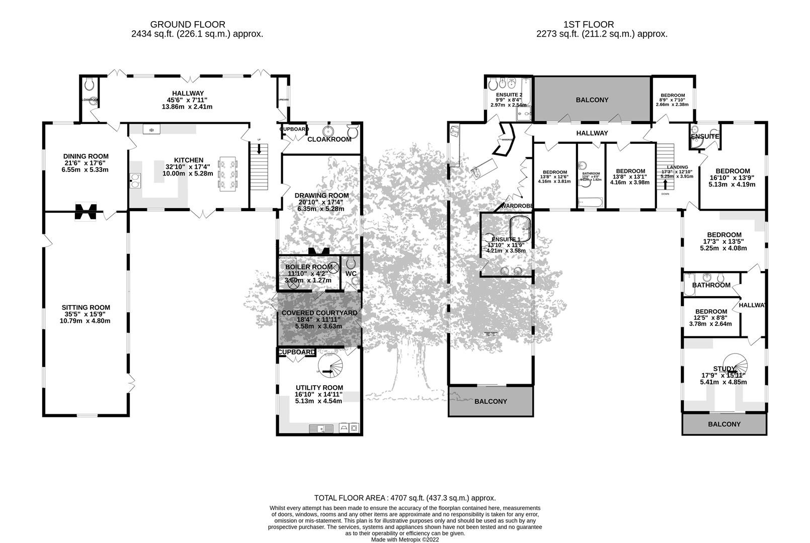 Welcomed into a generous hall which leads to multiple reception rooms; a formal dining room, 20m sitting room, expansive eat in modern kitchen with luxury fixtures and fittings and additional living room, all of which have garden views, fireplaces, good ceiling heights and great light. There are two ground floor WC's and large utility room/ work room. Upstairs there is a private office with double hardwood fitted desks with patio doors to balcony with pool and garden views.
