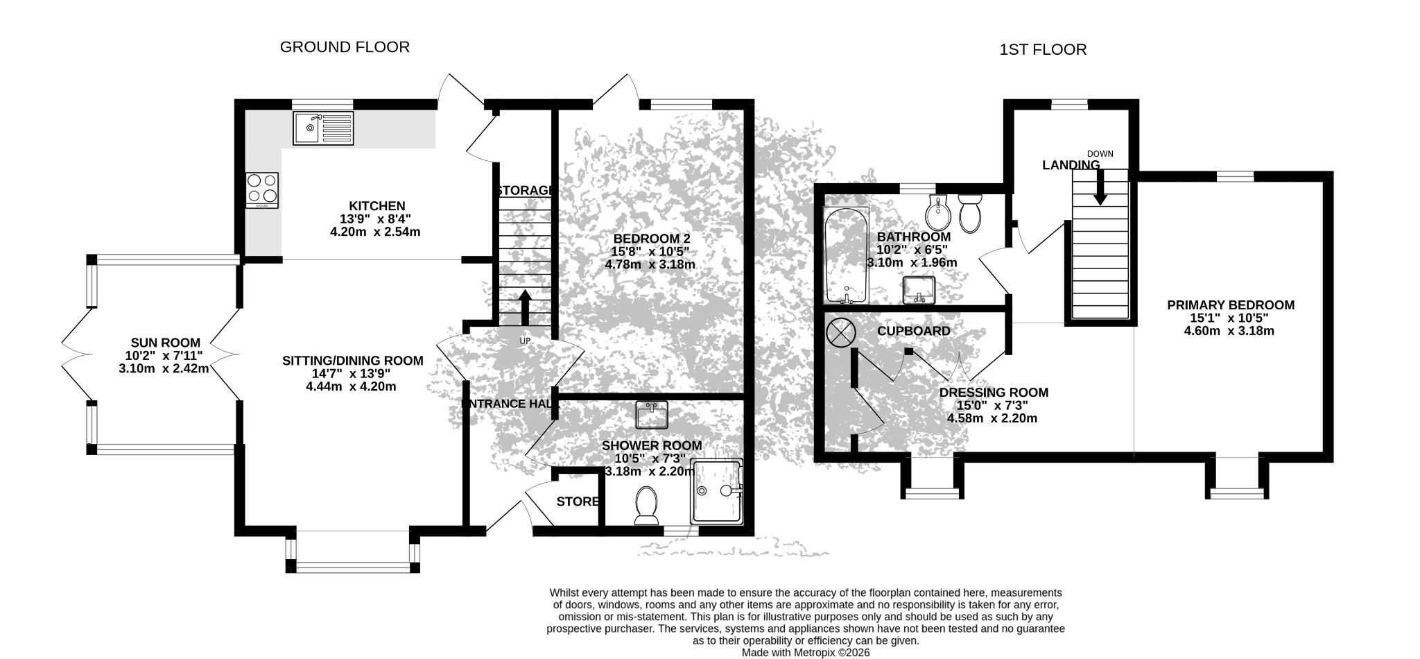 Two bedrooms including a spacious first-floor principal suite with built-in wardrobes and en-suite, plus a versatile ground-floor bedroom.