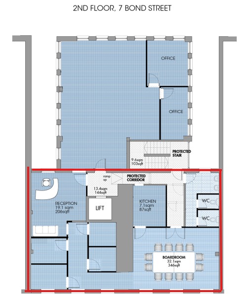 7 Bond Street is a mid-terraced building constructed over basement, ground and three upper floors. The property is of traditional masonry construction under a pitched roof. The property benefits from a modern entrance lobby and high quality communal areas. There is lift access to all floors. The 2nd floor office benefits from good natural light provision throughout and has been finished to a good quality specification: