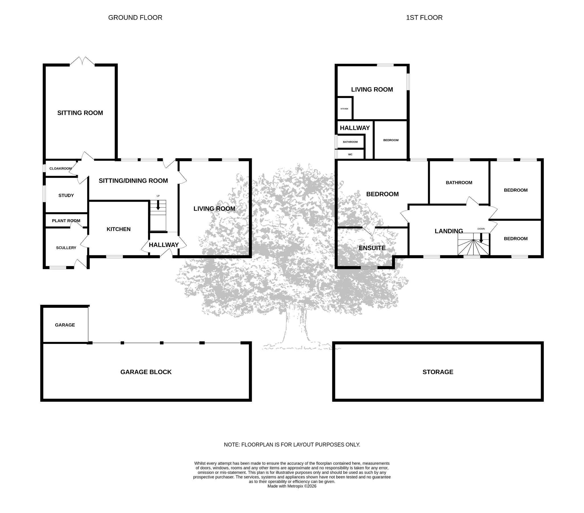 The main house comprises hallway, sitting room, living room, dining room, kitchen, scullery, study, plant room and cloakroom downstairs, plus three double bedrooms and two bathrooms - one ensuite - upstairs.