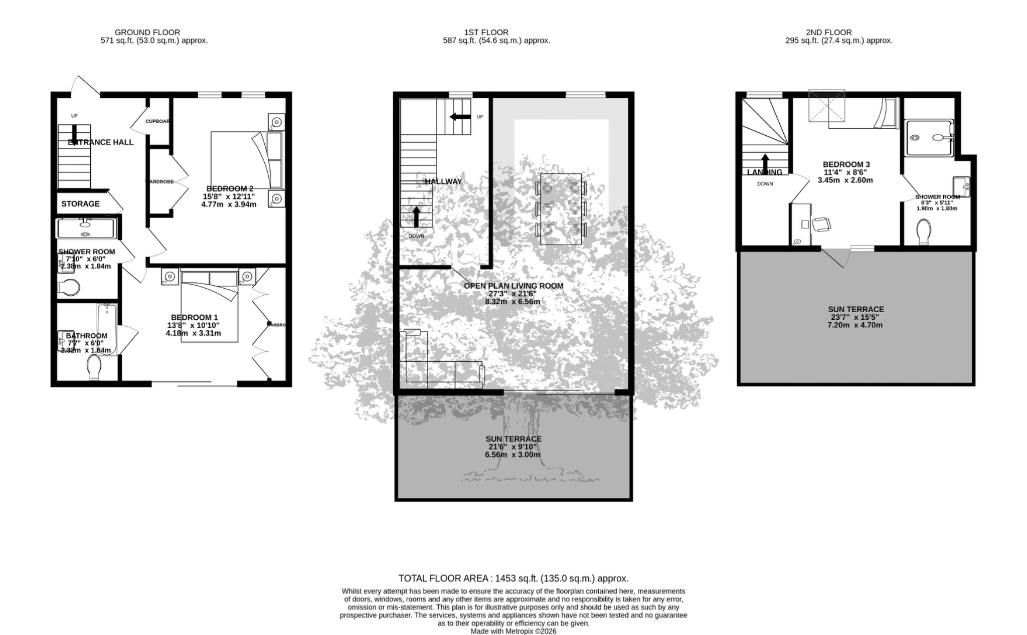 • Three good size bedrooms (two very spacious with fitted wardrobes), and three bathrooms (two en-suite)