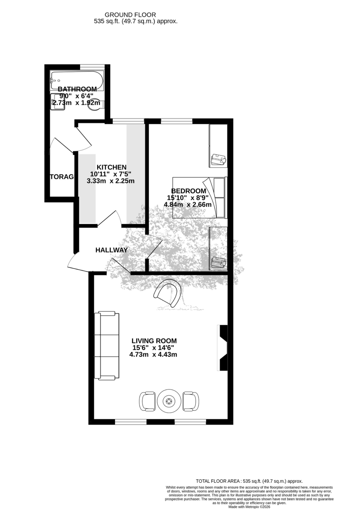 The separate fitted kitchen provides ample space for cooking and storage, ideal for everyday living. There is a good-sized double bedroom with built-in wardrobes.
