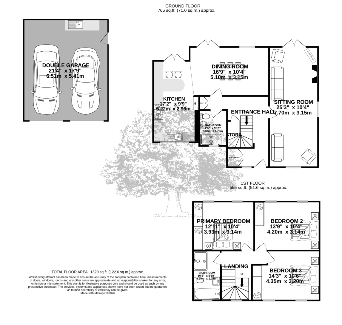 The main house extends to circa 1,320 sq ft and is in true walk-in condition. A lovely kitchen/diner provides the heart of the home, ideal for entertaining, while the elegant sitting room with wood-burning stove opens directly onto the landscaped garden, creating seamless indoor–outdoor flow. Fresh decoration, new carpets, re-plastered walls, underfloor heating to selected areas and plantation-style shutters add comfort and style throughout.