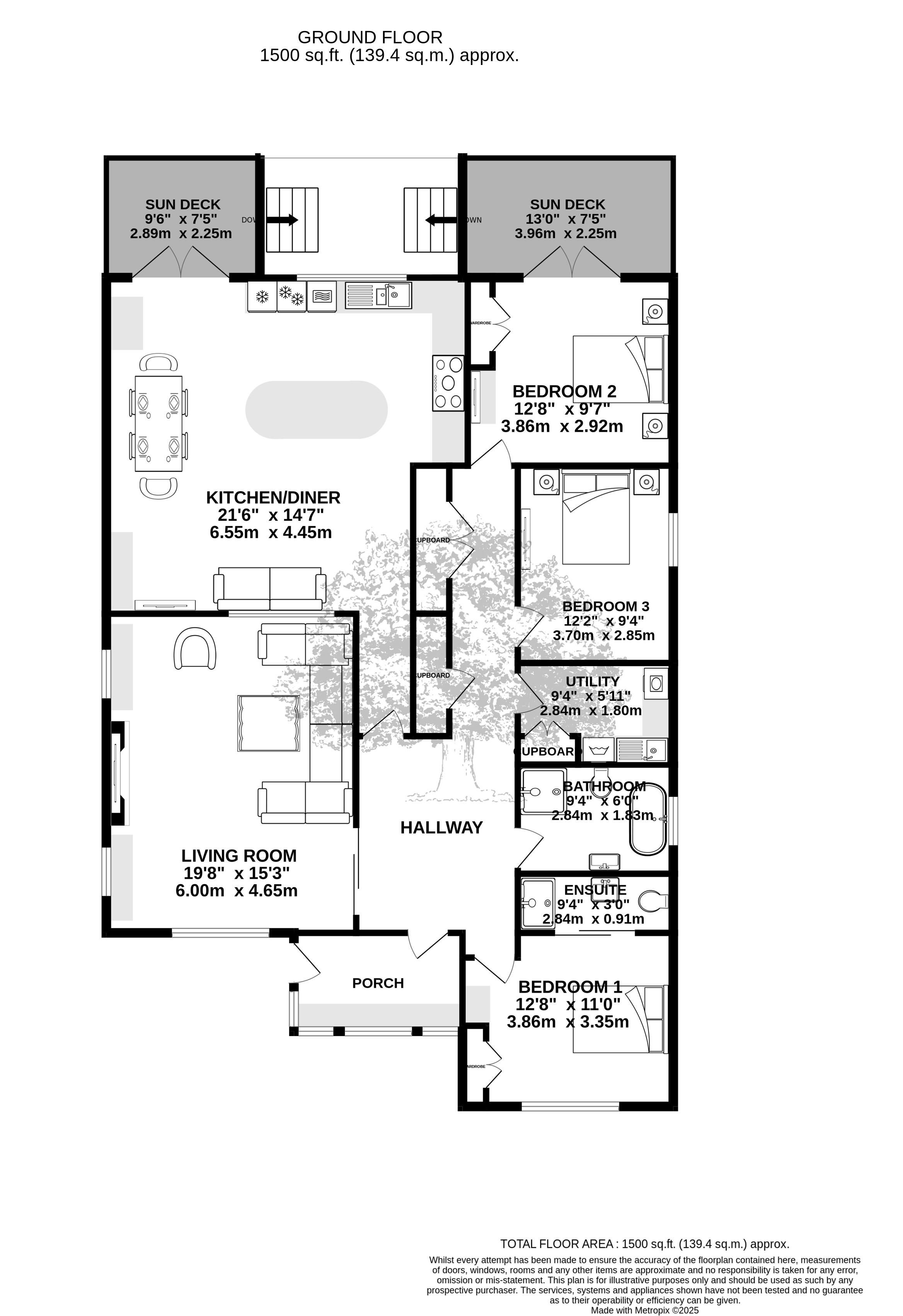 Three good size double bedrooms, two with fully fitted wardrobes. Two bathrooms, one ensuite. Bedroom two and the kitchen diner have sun terraces overlooking the garden.